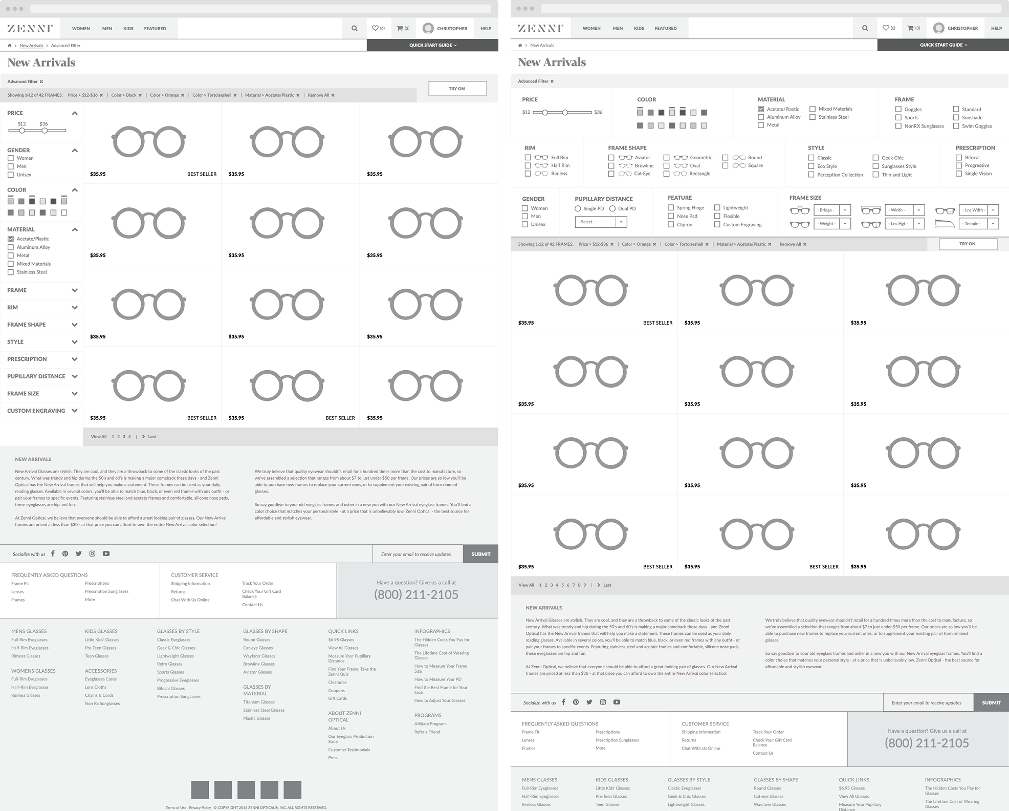 Zenni operates in a highly competitive space with players like Warby Parker, EyeBuyDirect, and traditional optical retailers expanding their online presence. Differentiation through design and digital experience was key. The redesign needed to both elevate Zenni’s brand appeal and offer a user experience that felt as intuitive and premium as its competitors without sacrificing Zenni’s signature value proposition.